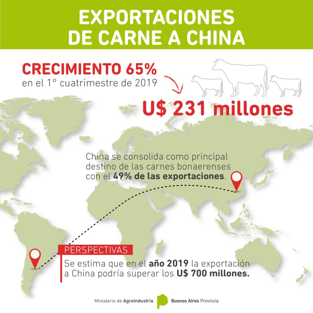 Las exportaciones de carne de la Provincia de Buenos Aires a China aumentaron un 65% en el primer cuatrimestre del 2019, alcanzando un total de U$231 millones. De este modo China se consolida como principal destino de las carnes bonaerenses concentrando el 49% de las exportaciones.