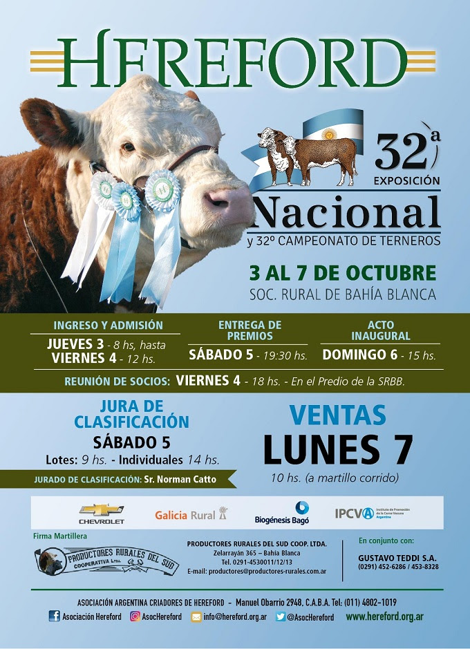 La Asociación Argentina Criadores de Hereford (AACH), que nuclea a ganaderos de la raza reconocida por su carne y gran adaptación a todas las zonas productoras del país, anunció su 32º Exposición Nacional y 32° Campeonato de Terneros Hereford que se desarrollará, del 3 al 7 de octubre próximos, en la Sociedad Rural de Bahía Blanca, Provincia de Buenos Aires, en el marco de la 135º Exposición Nacional de Ganadería e Industria a realizarse en el predio de Villa Bordeu.