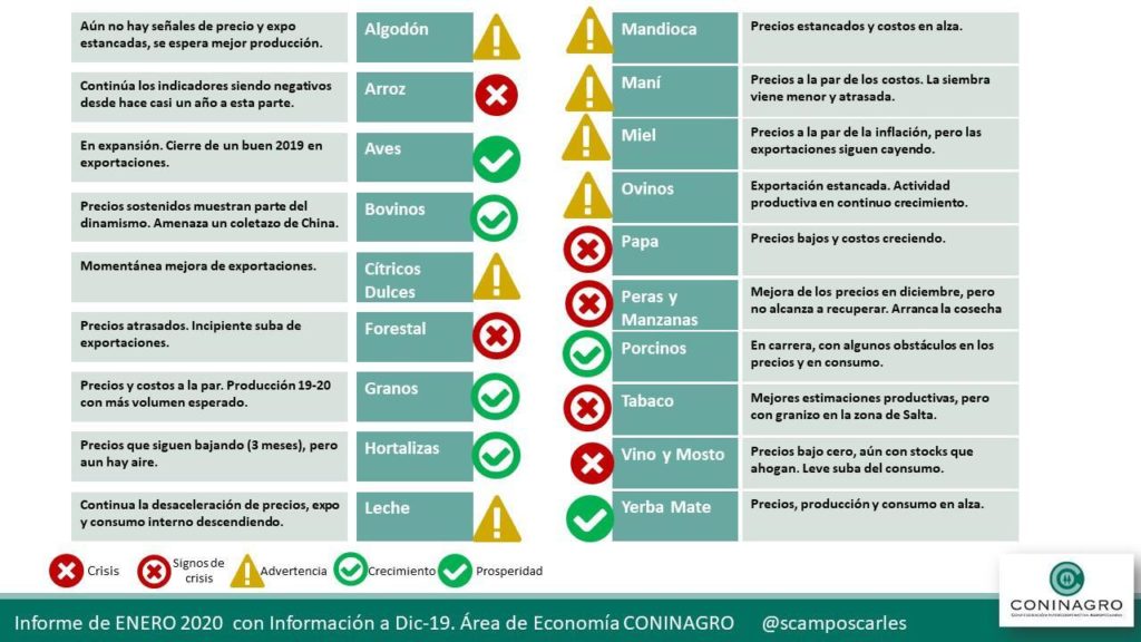 El informe mensual que pubIica CONINAGRO con 19 economías regionales monitoreadas por el Área de Economía sólo muestra seis producciones con signos de crecimiento o prosperidad (aves, bovinos, granos, hortalizas, porcinos y yerba mate que sigue con precios, producción y consumo en alza). Esta información surge del análisis realizado en enero con información a diciembre.