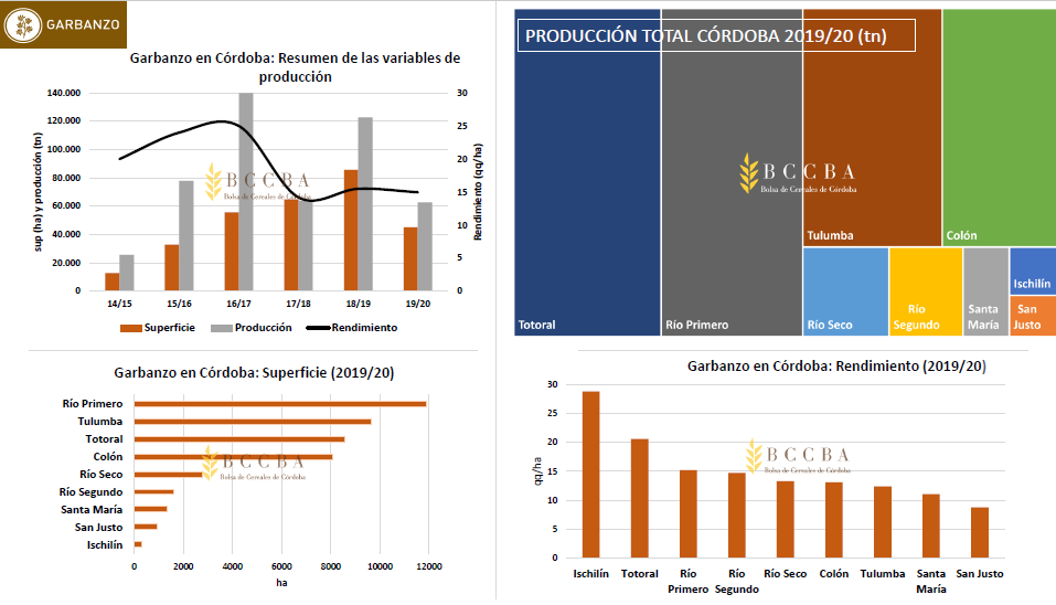 Producción de garbanzo en Córdoba para la campaña 2018/19 se ubicó en torno a las 62.600 toneladas. Este volumen significa una disminución del 49% respecto a la campaña pasada, debido principalmente a la baja del área sembrada en una proporción similar.