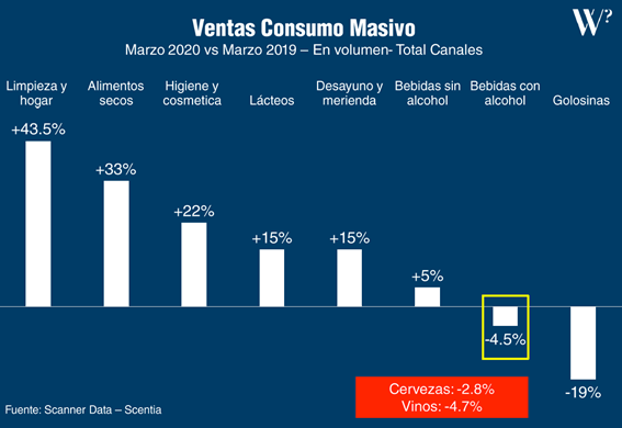 Datos de ventas en volumen de productos consumo masivo a nivel país en marzo de 2020 contra marzo de 2019, señalan un crecimiento de 16%. Pero este valor cuando se abre la categoría señala una dispersión muy importante pasando de segmentos con un crecimiento mayor al 40%, como en el caso de productos de limpieza y hogar o alimentos secos con +33%, a otros rubros con fuertes caídas. En este grupo se ubica el rubro bebidas con alcohol que registra una baja del 4,5% en sus ventas totales en volumen, con una disminución segmentada de 2,8% en cerveza y 4,7% en vino, según datos relevados por la consultora W, que dirige Guillermo Oliveto.