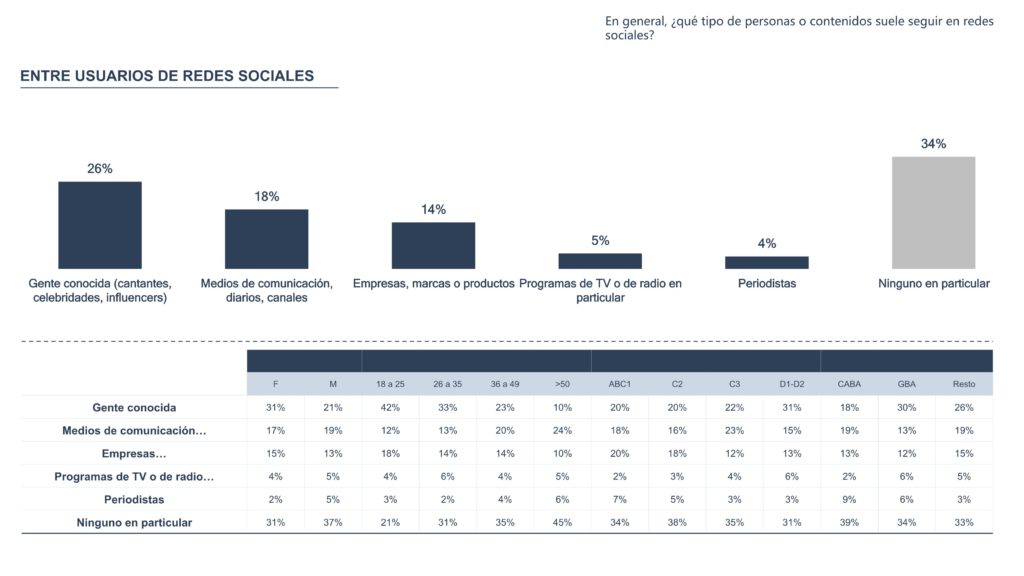Las redes sociales hoy en día son un fiel reflejo de la forma de pensar y actuar de la gente. El conocimiento de a quien siguen las personas en las redes sociales permite inferir sobre sus intereses, preferencias y las opiniones de la gente por distintos temas. De hecho, las principales comunidades digitales argentinas se constituyen sobre la base de gente conocida (cantantes, celebridades, influencers, etc) que marcan el rumbo en un marco de incertidumbre y falta de confianza cada vez mayor. Los medios de comunicación y las propias marcas o productos en particular siguen en orden de importancia, pero los “famosos” han tomado una ventaja importante en esta era de la distracción.