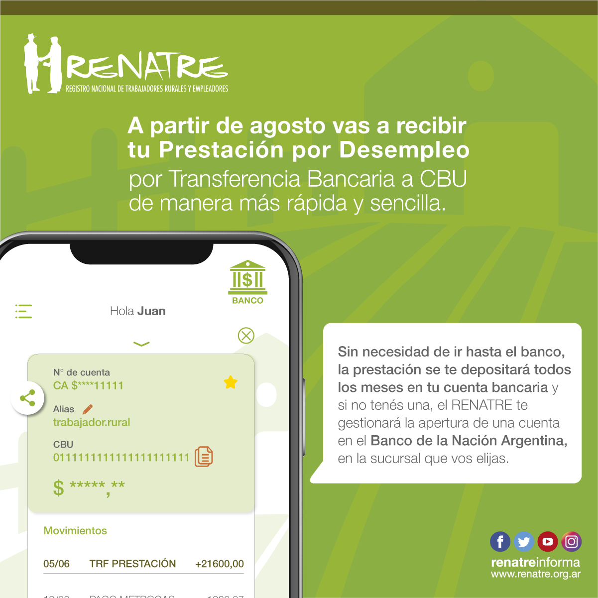 El Registro Nacional de Trabajadores Rurales y Empleadores (RENATRE), a través de una decisión adoptada por el Cuerpo Directivo, decidió que realizará los pagos a trabajadores y trabajadoras rurales beneficiarios de la Prestación por Desempleo ordinaria sólo por transferencia bancaria a través del CBU, a partir del mes de agosto.