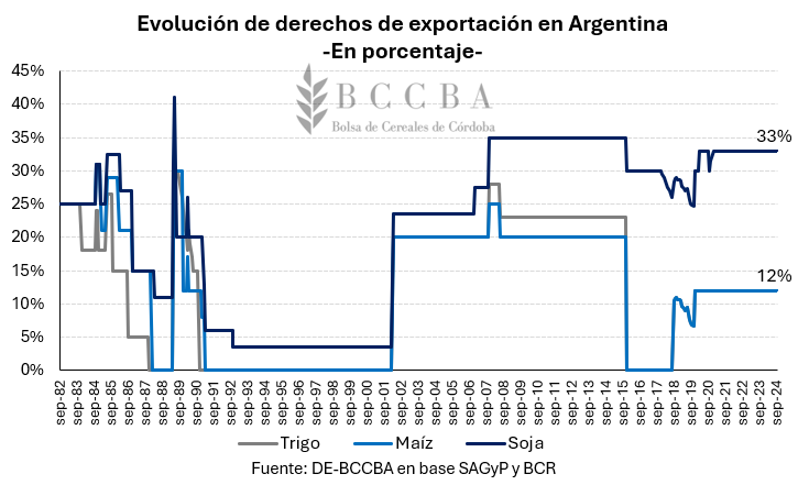 La mayor alícuota para el trigo se presentó en junio de 1989 posicionándose en 30% y manteniéndose hasta agosto de aquel año, para luego, ir reduciéndose hasta llegar a 0% en noviembre de 1990. Mientras que, para el maíz, el mayor porcentaje registrado fue del 31% en octubre 1984, y se redujo al 0% a fines del año 1990. En marzo de 2002, los DEX para ambos cultivos se ubicaron en el 10%, para luego subir al 20% en abril, manteniéndose por un período de cinco años. A fines de 2008, los DEX para el trigo suben nuevamente, para ubicarse en un nivel del 23%.