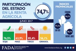 FADA (Fundación Agropecuaria para el Desarrollo de Argentina) publicó su informe trimestral. El Índice Fada junio 2017 fue de 74,7%. El anterior de marzo 2017, había sido de 66,2%. La primer novedad indica que participación del Estado sobre la renta agrícola subió, pero no por efecto de los impuestos sino de los costos y los precios internacionales.