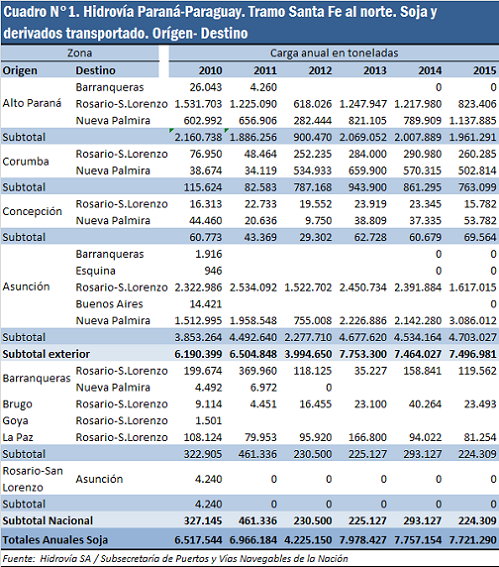 En el cuadro N°1 se analiza el transporte de soja y derivados en el tramo citado. Los nodos portuarios de Nueva Palmira (Uruguay) y el Gran Rosario son los destinos finales de toda esa mercadería, que totalizó en el año 2015 unos 7,7 Mt. Como puede verse, el 60% de la misma tuvo como origen las terminales portuarias ubicadas en la zona de influencia de Asunción del Paraguay (unas 4,7 Mt).