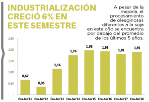 El procesamiento de soja representó la mayor parte de estos valores, con un incremento de la molienda de 5,8%, a pesar de que en el mes de junio se registró una leve reducción en comparación al sexto mes del año pasado, con 316.346 toneladas.