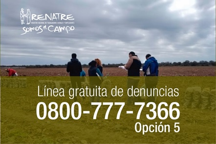 Ante cualquier denuncia por malas condiciones de trabajo, trabajo infantil y/o explotación laboral, el RENATRE cuenta con la línea gratuita 0800-777-7366, opción 5, donde podrán ser atendidos en forma anónima por profesionales capacitados en la materia.