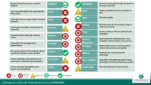 Se da a conocer el décimo semáforo que elaboramos en Coninagro. El análisis de cada actividad durante noviembre se resume en el cuadro que indica, en esta oportunidad, 11 producciones en rojo, 4 en amarillo, 4 en verde.